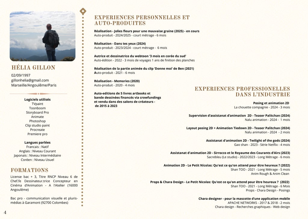 Diplômée en 2021 de L'Atelier (école de cinéma d'animation 2D), j'ai commencé mon parcours professionnel en travaillant pour des films d'animations 2D. Je suis passionnée de cinéma et j'élabore des courts métrages d'animation 2D que j'écris et réalise.