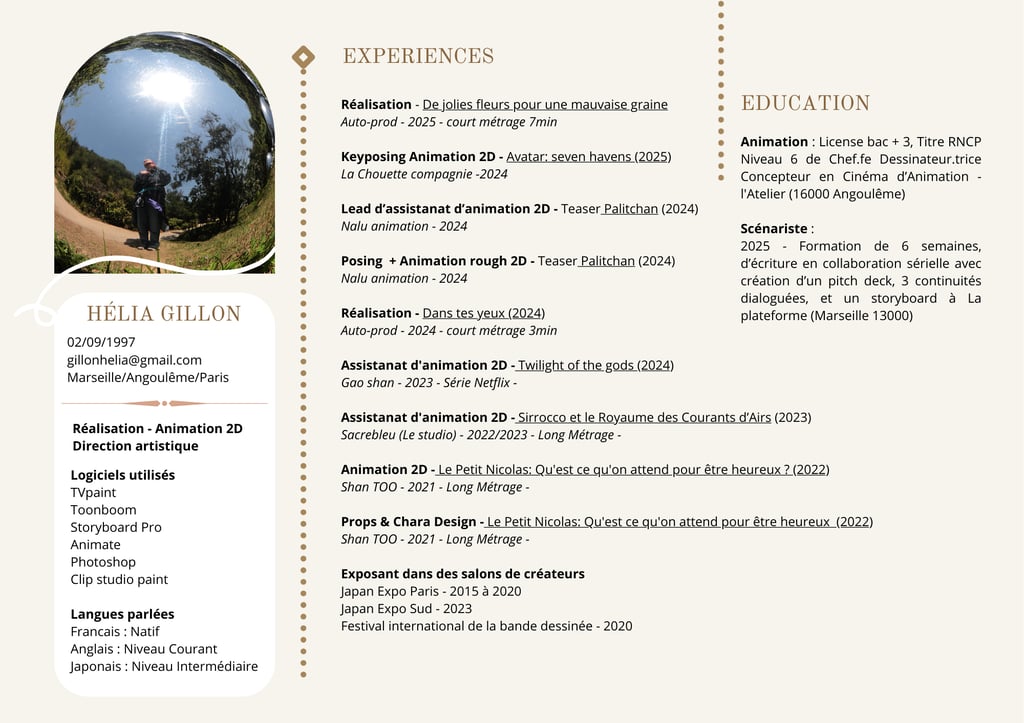 Hélia a su très tôt qu’elle souhaiterait écrire et raconter des histoires, étant tombée amoureuse de l’animation 2D, elle a eu envie de tout apprendre sur ce milieu et sur les métiers qui le façonnent.