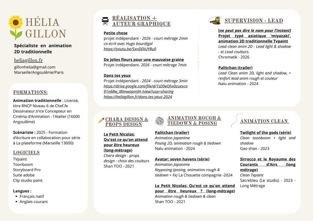 Hélia a su très tôt qu’elle souhaiterait écrire et raconter des histoires, étant tombée amoureuse de l’animation 2D, elle a eu envie de tout apprendre sur ce milieu et sur les métiers qui le façonnent.